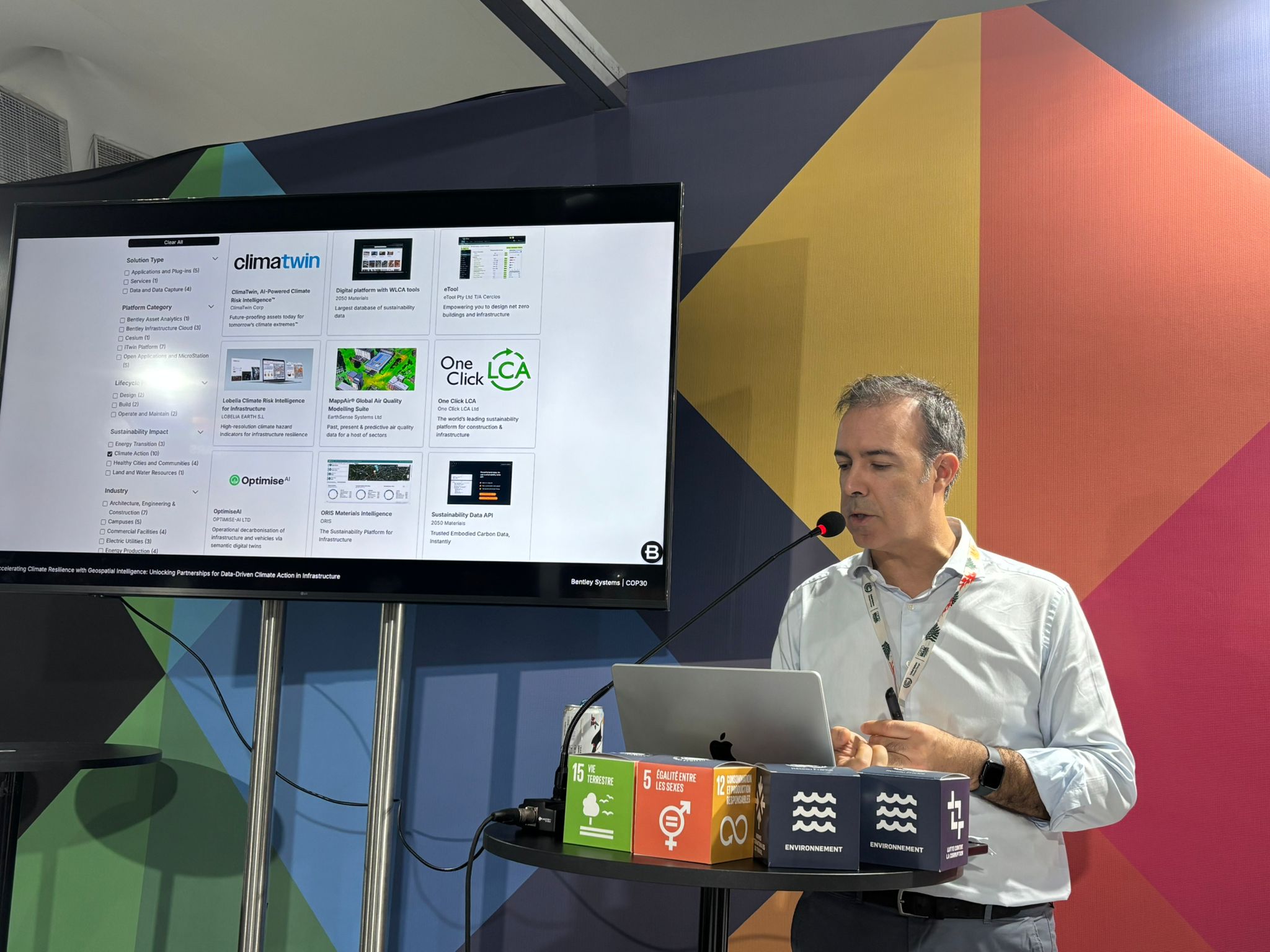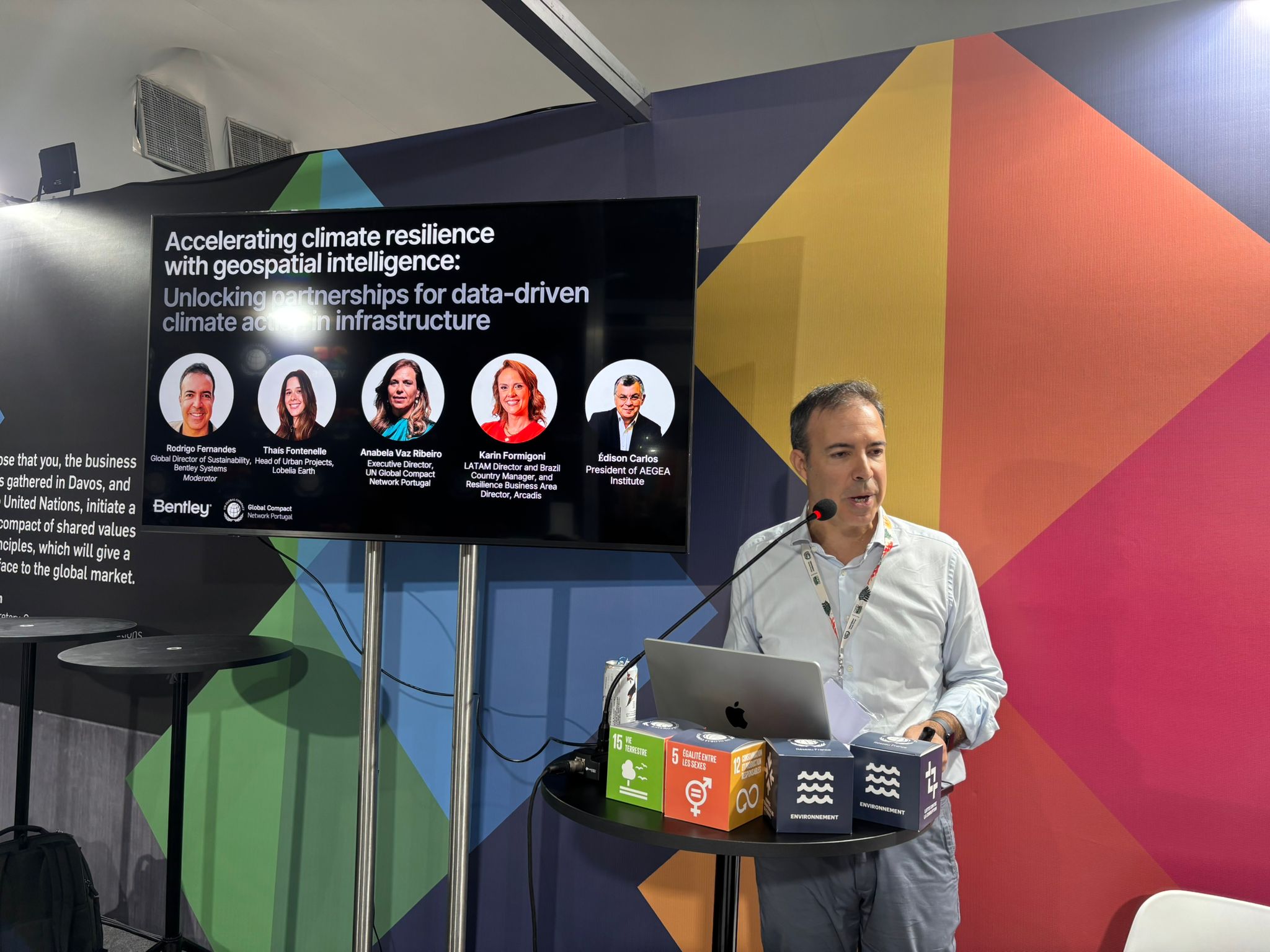 PARCERIAS: temos orgulho de firmar parcerias com uma série de empresas na COP30, incluindo o Pacto Global da ONU, a Coalizão Internacional para Infraestrutura Sustentável (ICSI), o Instituto para Infraestrutura Sustentável (ISI), o Conselho Empresarial Mundial para o Desenvolvimento Sustentável (WBCSD) e nossos valiosos usuários da Bentley presentes no evento. Nossa plataforma de gêmeo digital de infraestrutura aberta e colaborativa é essencial para impulsionar e ampliar parcerias e colaboração no ecossistema.